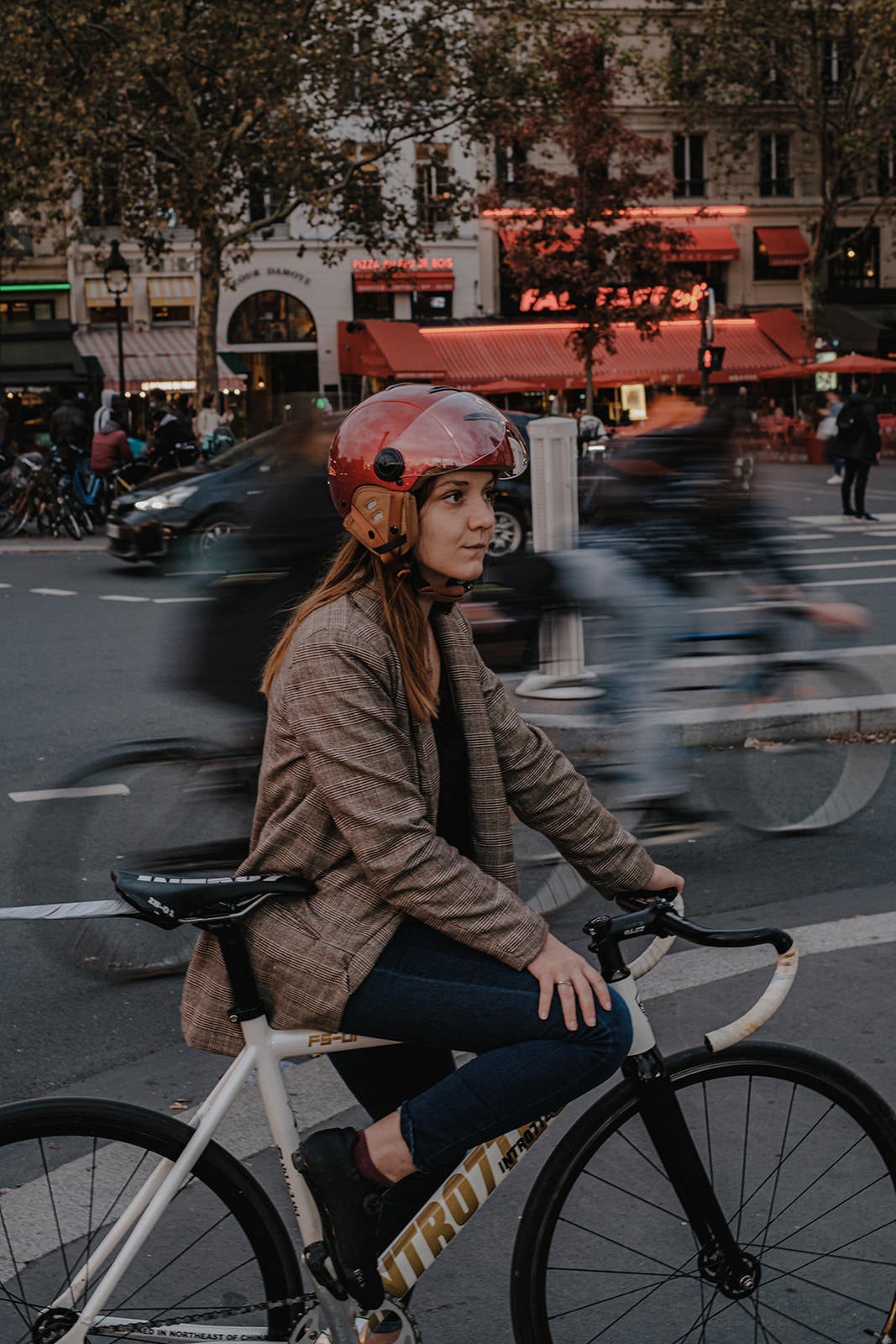 Casque Vélo Urbain Mârkö Helmet Tandem Rouge Cherry porté par une femme sur un vélo
