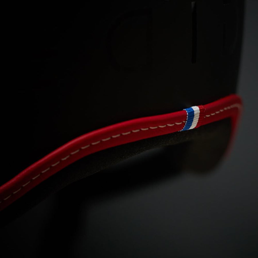 La coque en résine s’habille d'un jonc en cuir qui fait le tour du casque pour apporter la touche de raffinement à la française.