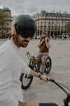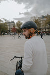 Casque Vélo Urbain Mârkö Helmet Tandem Blanc Ivory porté par une femme qui l'attache