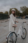Casque Vélo Urbain Mârkö Helmet Tandem Blanc Ivory porté par une femme qui l'attache