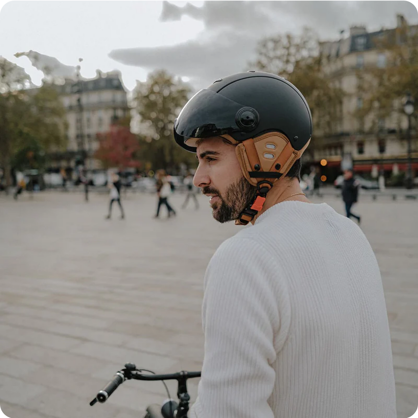 Casque Vélo Urbain Mârkö Helmet Tandem Champagne vue de 3/4 avec visière baissée et oreillette montée