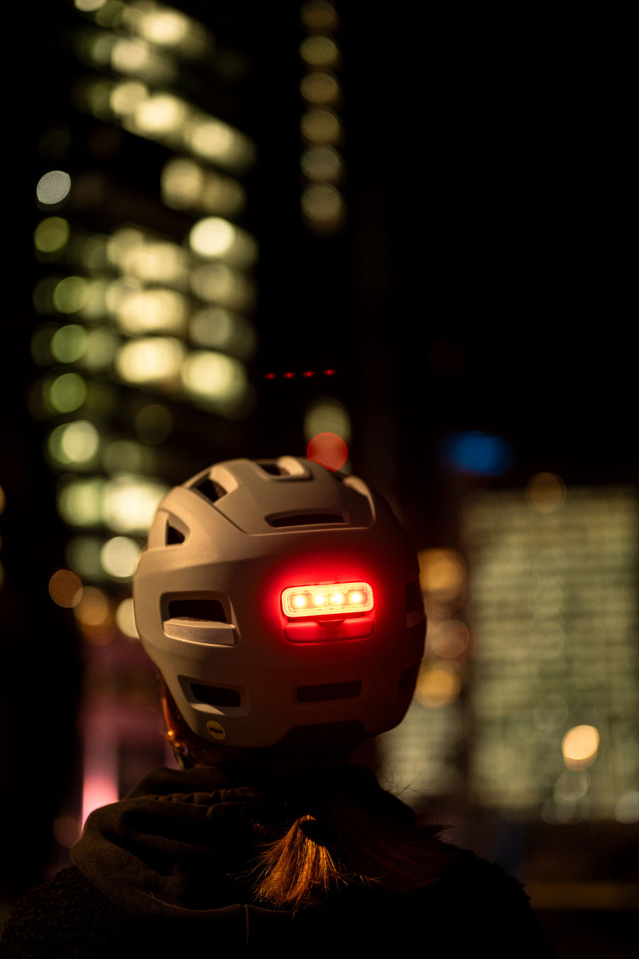 Le casque est équipé d’un éclairage arrière LED rechargeable par USB. Il propose plusieurs modes d’éclairage, notamment fixe, pulsé et clignotant, afin d’améliorer la visibilité du cycliste sur la route.