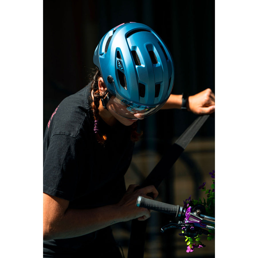 L’éclairage LED arrière magnétique rechargeable par USB améliore la visibilité en ville. La visière ajustable en polycarbonate protège efficacement contre le vent, la poussière et les insectes tout en restant amovible selon les besoins.