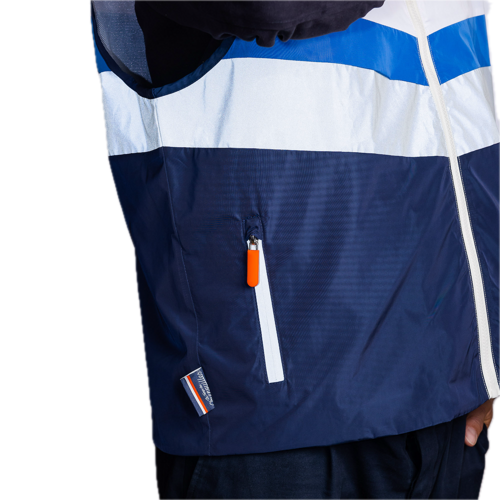 Dotée de bandes réfléchissantes haute visibilité, cette veste assure une sécurité optimale lors de vos déplacements nocturnes ou par faible luminosité. Idéale pour les cyclistes urbains, les joggeurs ou les piétons, elle vous rend visible des autres usagers de la route.