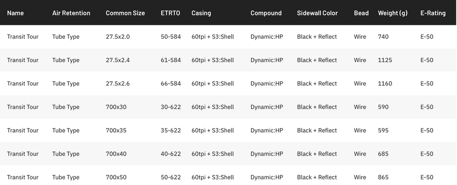 Le Transit Tour est proposé en 700x35, 700x40 et 700x50 ainsi qu’en 27,5 x 2.0, 27,5 x 2.4 et 27,5 x 2.6. Il s’agit d’un pneu Tube Type, noir avec bandes réfléchissantes latérales.