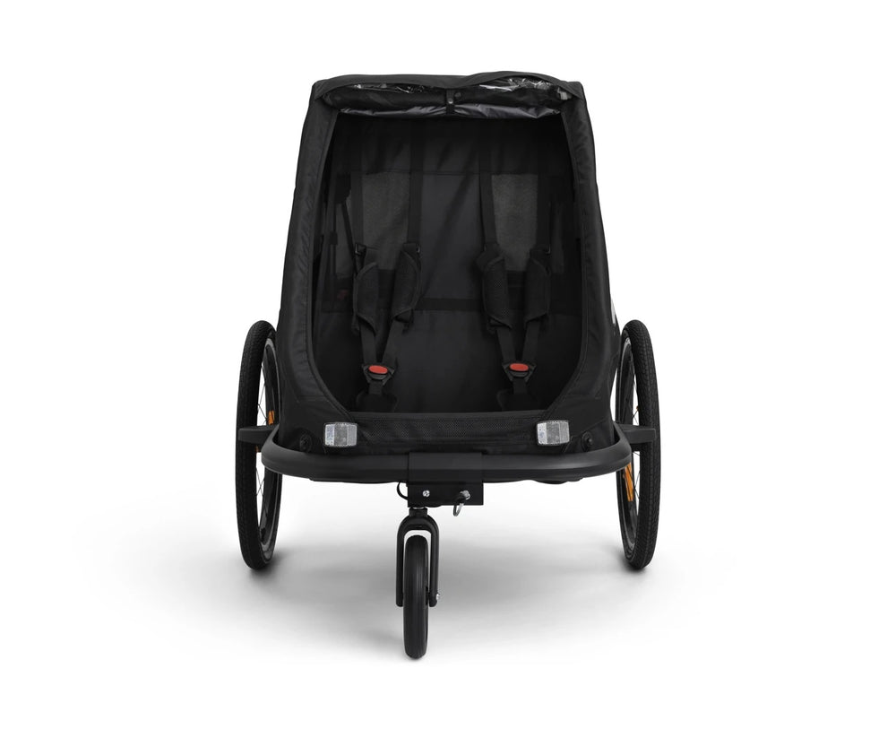 Les enfants peuvent profiter à la fois de balades à vélo et de promenades à pied dans un seul et même équipement. L’espace intérieur permet à deux enfants de s’installer confortablement côte à côte. La grande fenêtre supérieure facilite le contact visuel avec votre enfant.