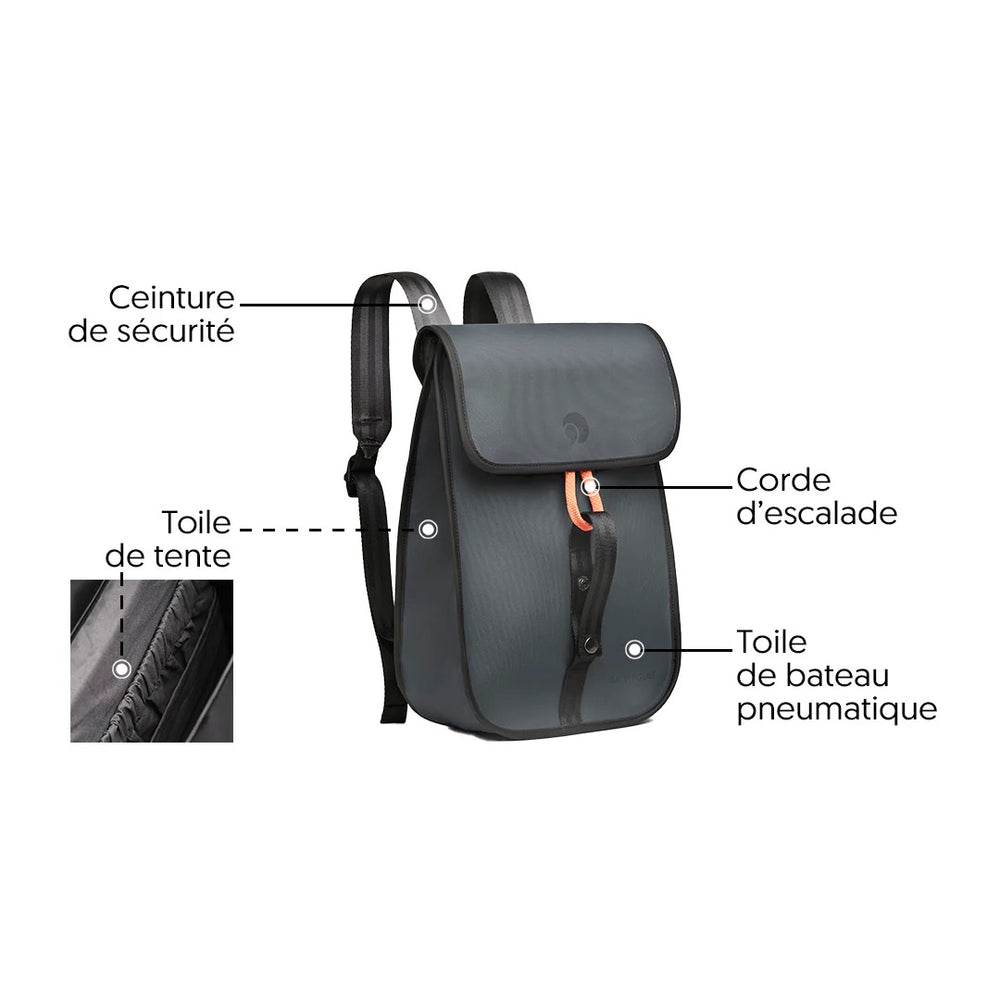 Oui, sa toile extérieure est issue de bateaux semi-rigides recyclés, un matériau naturellement imperméable et très résistant aux intempéries. Il protège vos affaires de la pluie ou des éclaboussures.