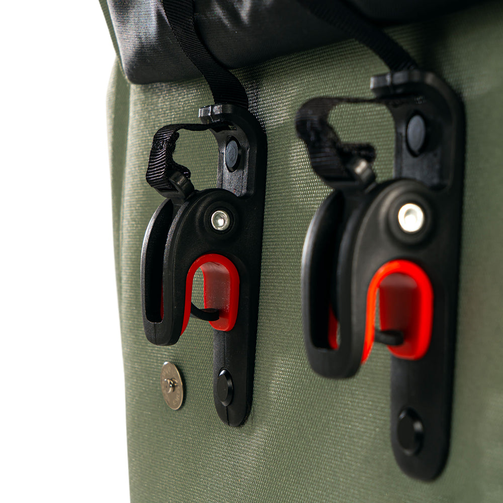 Le système de crochets permet une fixation rapide sur le porte-bagages, compatible avec les vélos électriques. Une fois descendu du vélo, les bretelles amovibles permettent de transformer la sacoche en sac à dos en quelques secondes, pour une utilisation flexible au quotidien.