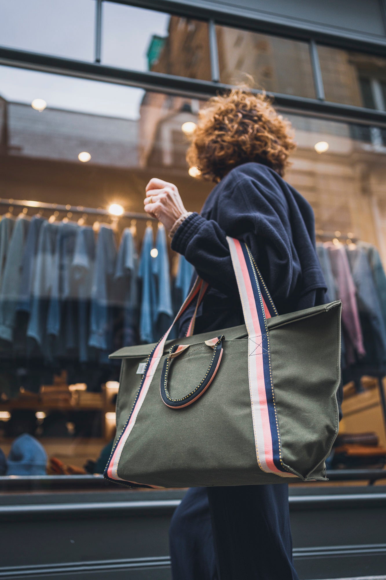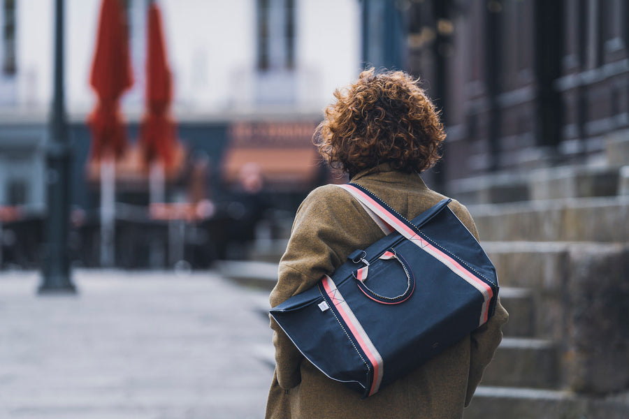 Le modèle Etincelle se transforme en sacoche vélo ou sac à main pour transporter l'ensemble de vos affaires ou de faire vos courses à vélo.