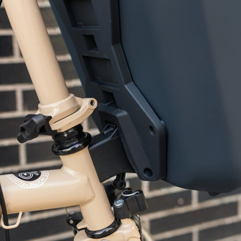 La sacoche s’adapte parfaitement au support avant des vélos Brompton grâce à son ancrage exclusif. Ce système permet une installation simple et sécurisée sans compromettre la maniabilité du vélo. Grâce à son design frontal équilibré, le poids reste centré pour préserver le confort de conduite.