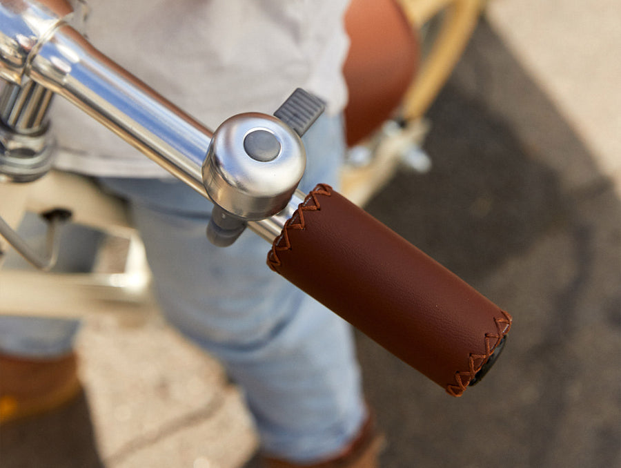 Une selle couleur Camel, des poignées avec des finitions coutures contrastantes, une sonnette et bien sûr badge Voltaire à l’avant !